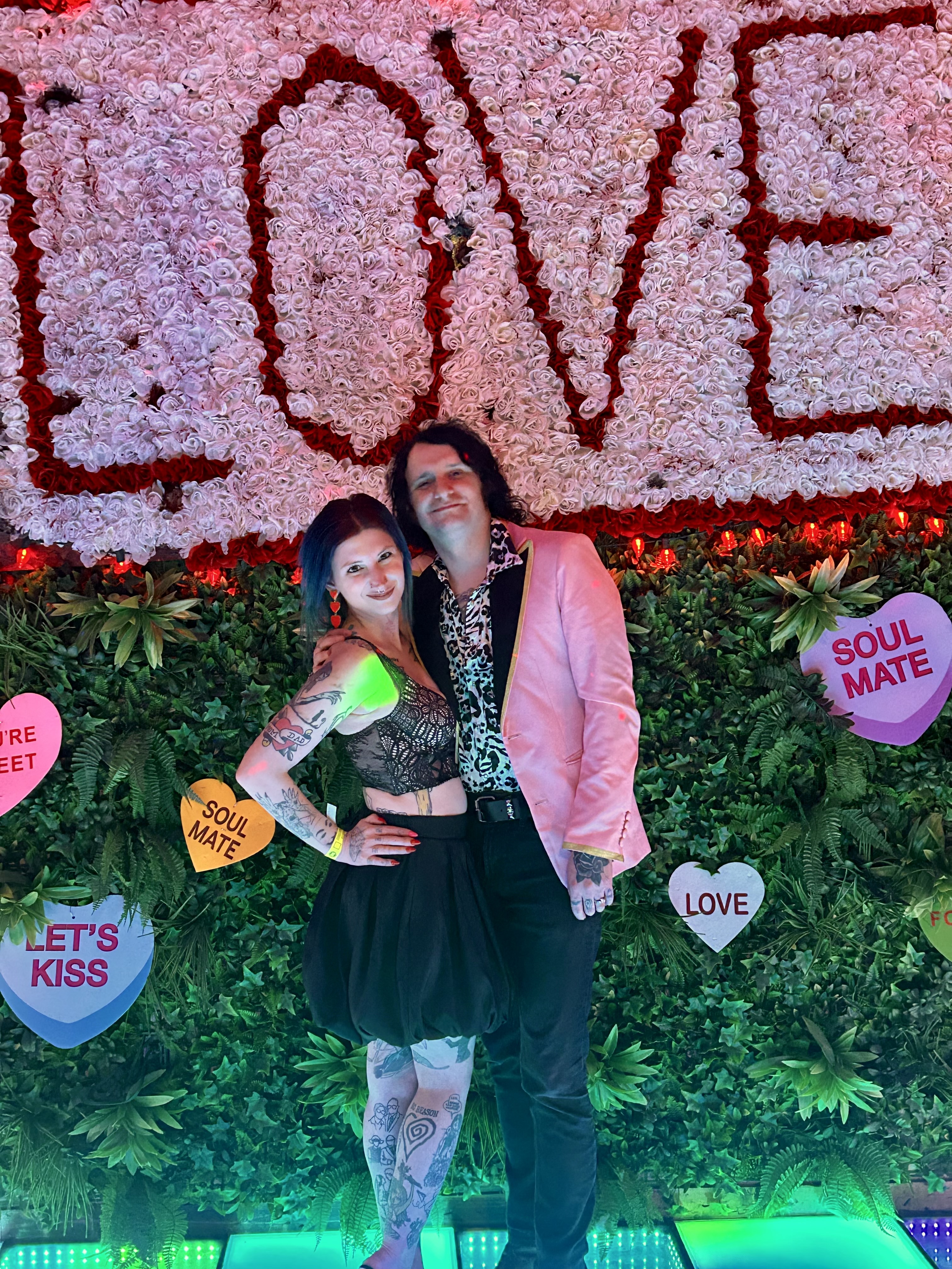 After dinner, we made a quick stop back at our apartment to put our takeaway containers in the fridge as it was close to fifty degrees that evening. It was like a bonus Valentine’s Day gift to put on a skimpy little something and not freeze my nads off! Then, off to the Haunted Schoolhouse and Laboratory we went for their Cupid’s Revenge event. The festivities began with a cocktail hour at six o’clock with the haunt opening at seven. The setup was so unbelievably cute with a light up dance floor, flower wall, photo stations, and the haunt actors lurking around for photo ops. Honestly though, it was kind of a sad affair to start with as it wasn’t a raging crowd and everyone remained glued to their own tables. That was no problem for Johnny and I because we immediately made friends to booze and schmooze with and chattered the cocktail hour away until the gates opened for the haunt.