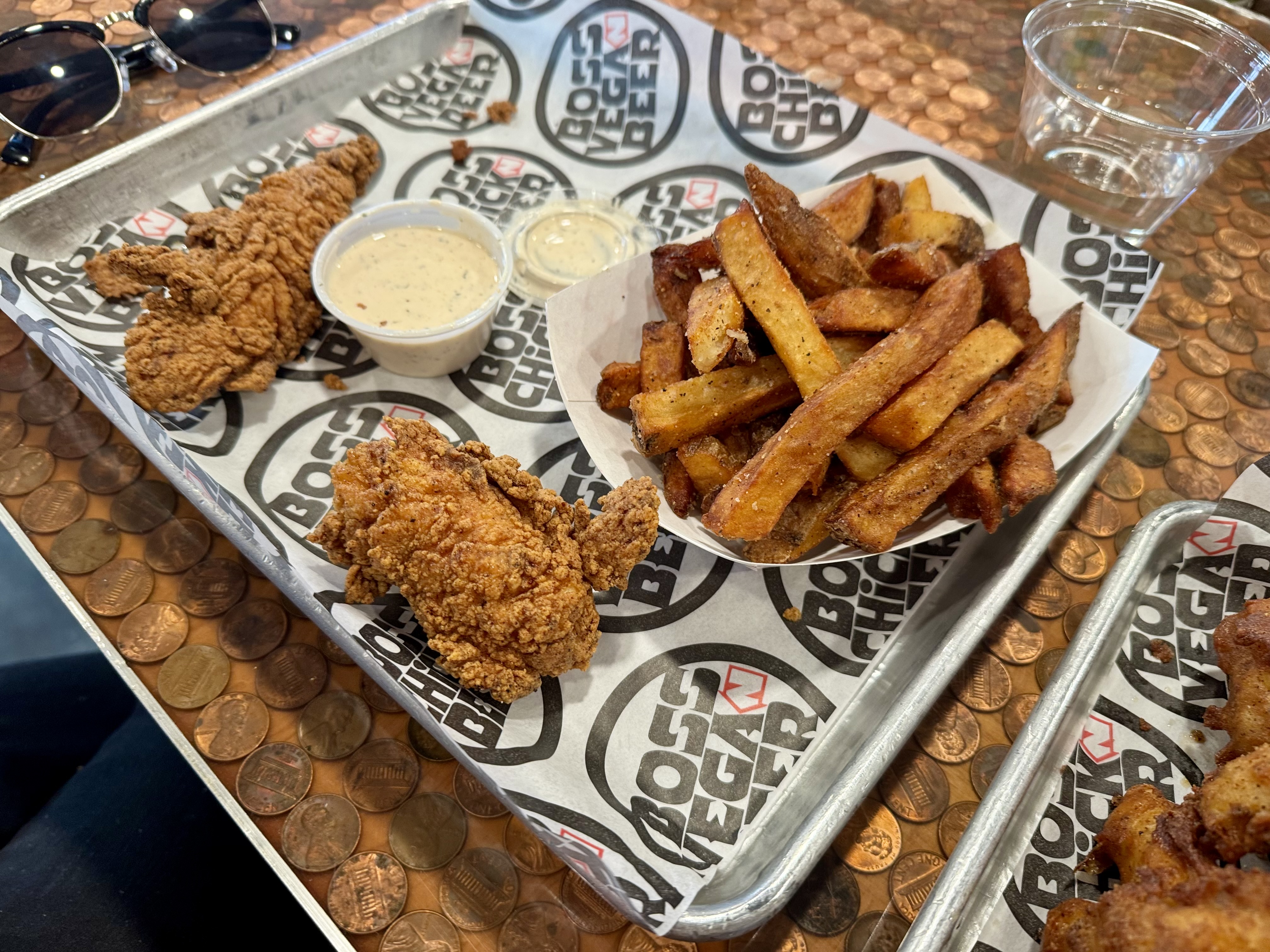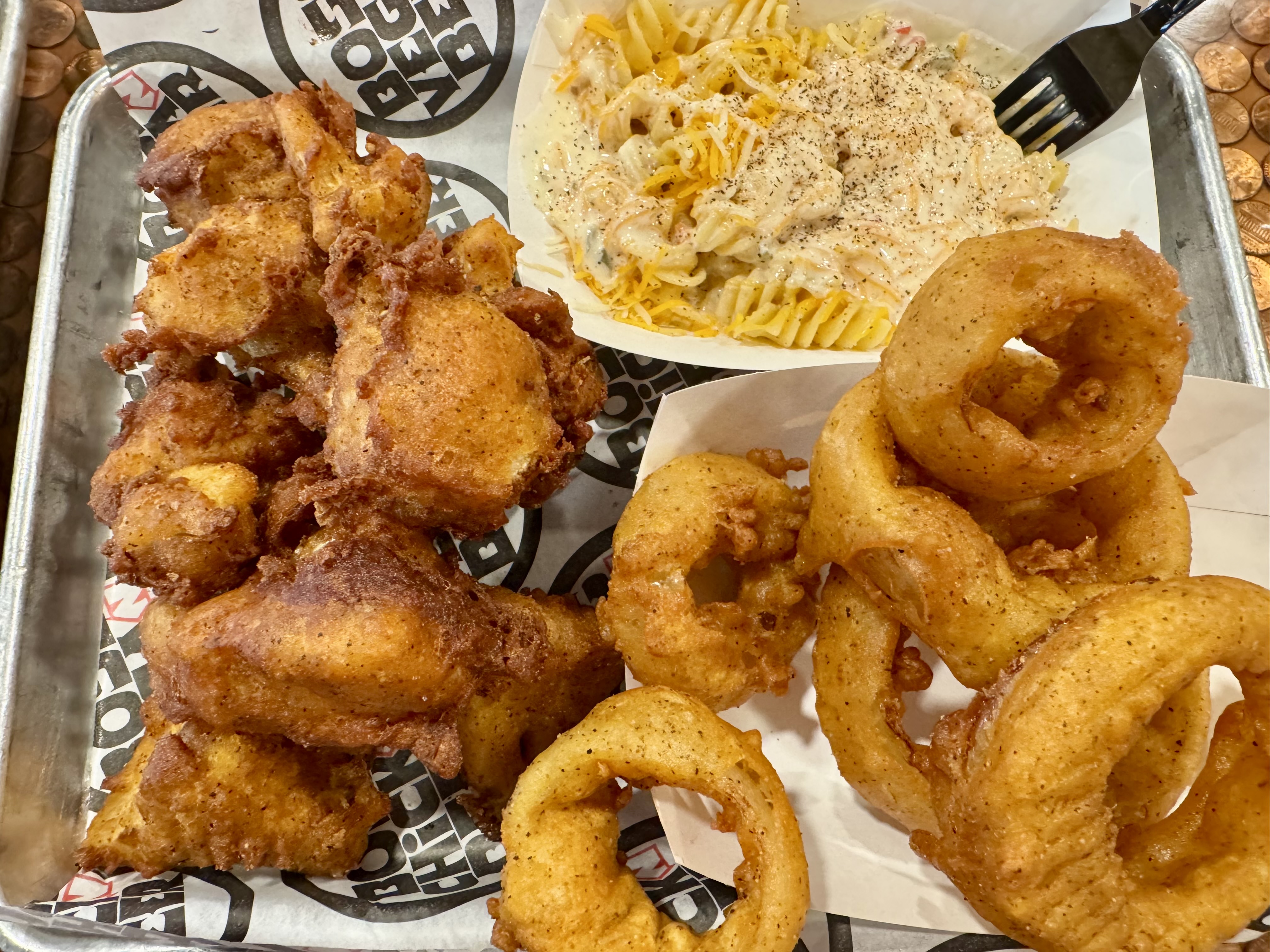 Johnny ordered the chicken tenders and fries while I opted for a side of their queso mac, cauliflower wings, and an order of onion rings to share. The food is made right in front of you at Boss Chick and those onion rings looked way too good to pass up! As always, our meals were absolutely incredible and their cauliflower wings are easily the best I have ever had. They use full on florets, the most delicious breading that is so good that you don’t even need sauce, but obvi you’re going to get their homemade sauces too! They are so very filling that I barely made a dent in mine but I got to enjoy our meal again and again with everything we took home. 😀