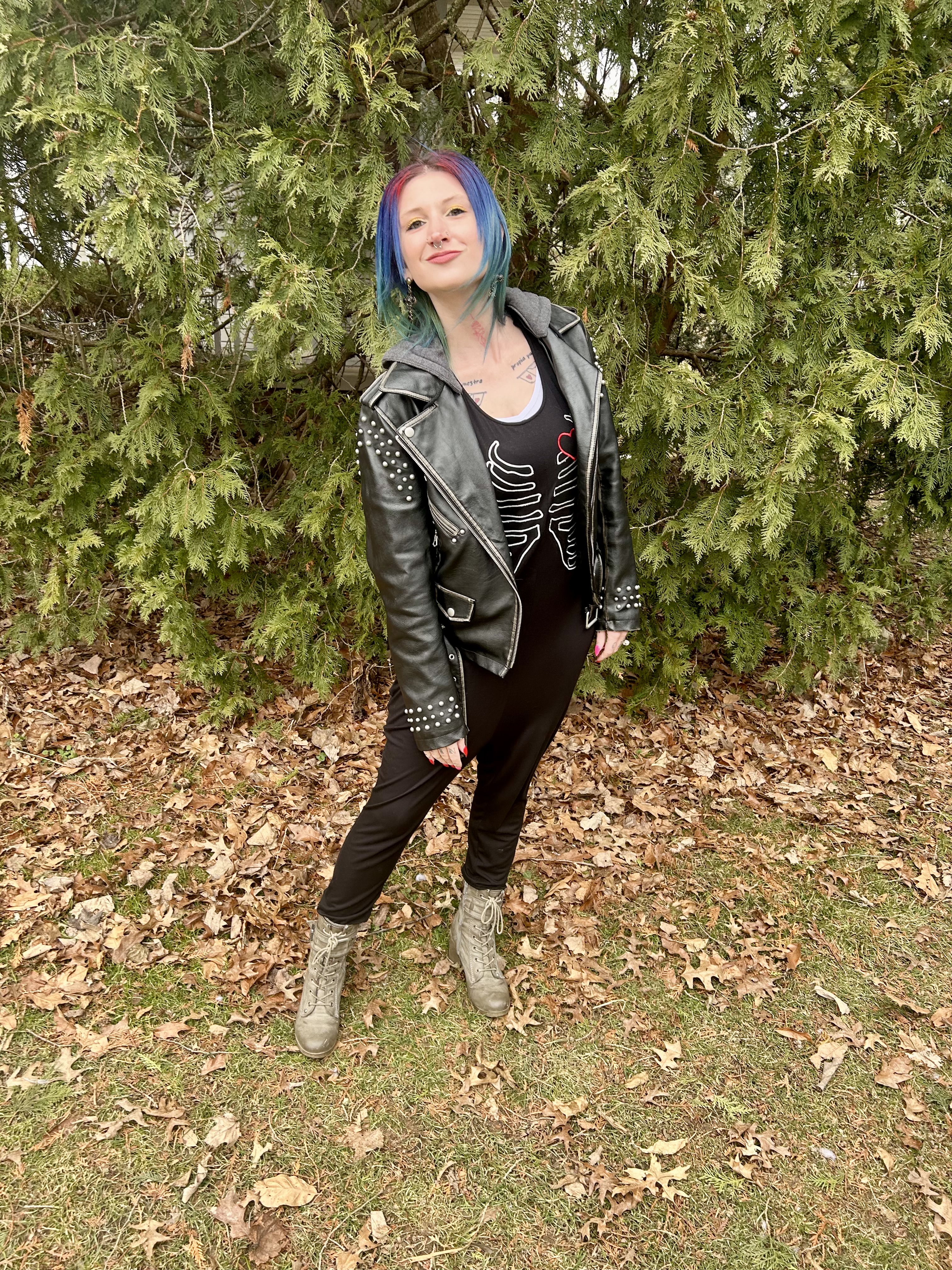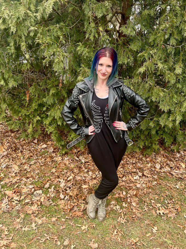 As I went through my mental Rolodex for this outfit, I was trying to think if I had any clothes that fell under the “sporty” category. My options were, admittedly, very limited and I kept circling back to my Fervour jumpsuit. While it might not be Sporty Spice, it was casual, cool, and comfy and I decided to go for it. This jumpsuit is just so damn cute! Of course, I love the embroidered skeleton motif but the shape is ultra trendy with the dropped crotch and armpit area too so you can pair it with a fun bralette. Since we were going to a hockey game, I didn’t go the bralette route because cold. So, I paired it with a white tank underneath to keep that region covered. I actually like this jumpsuit better with the tank top so I never have to worry about wardrobe malfunctions!