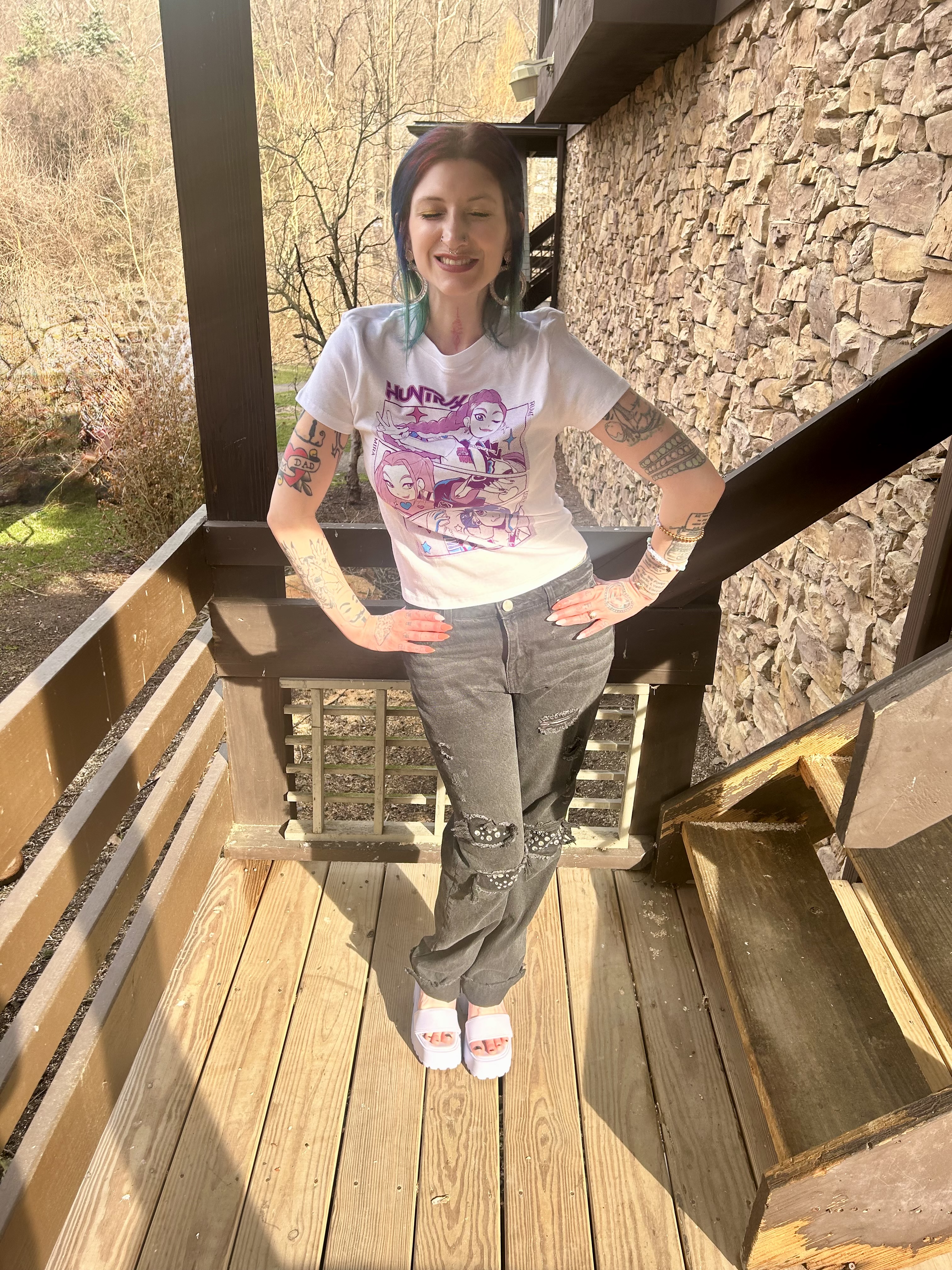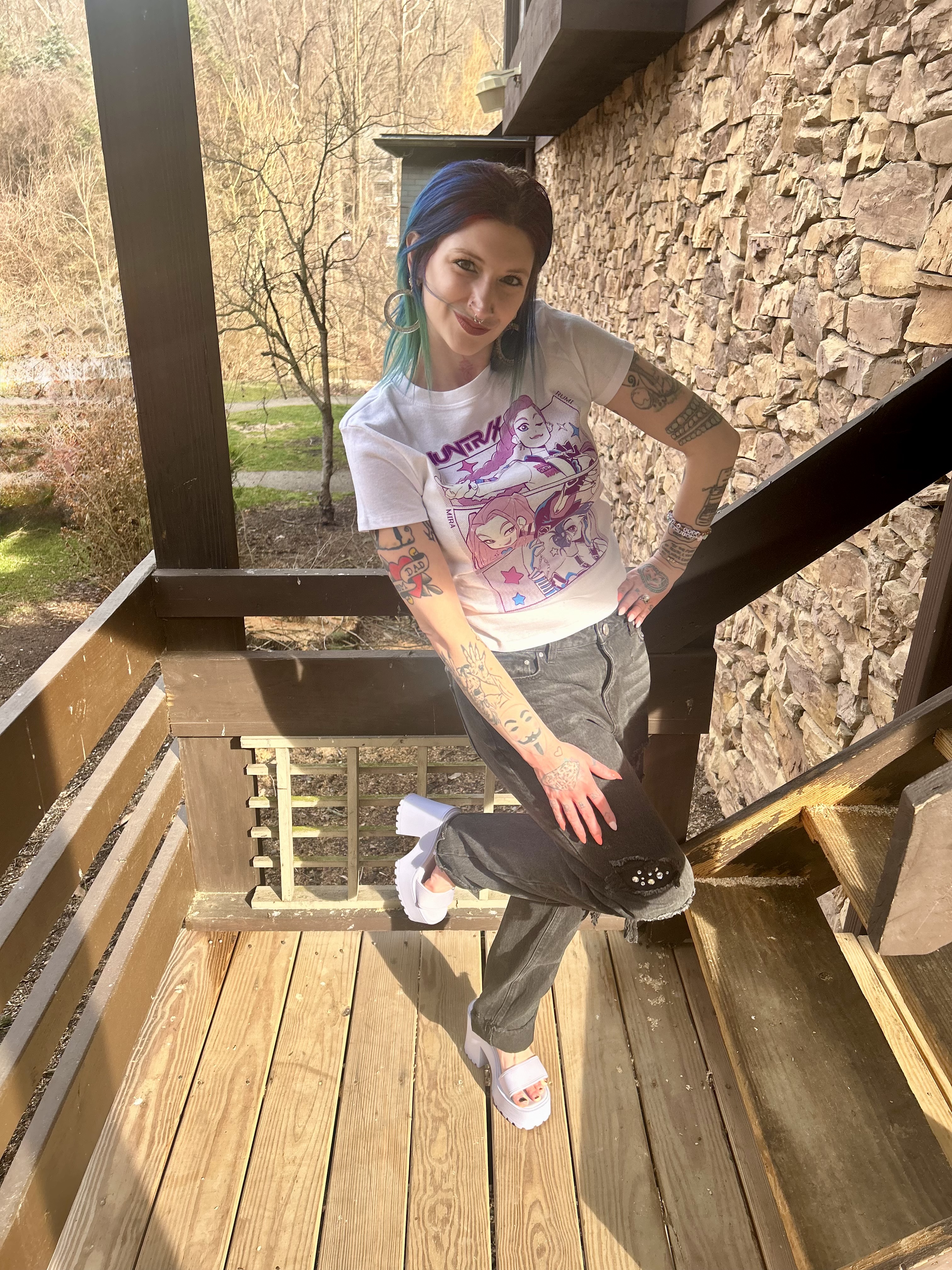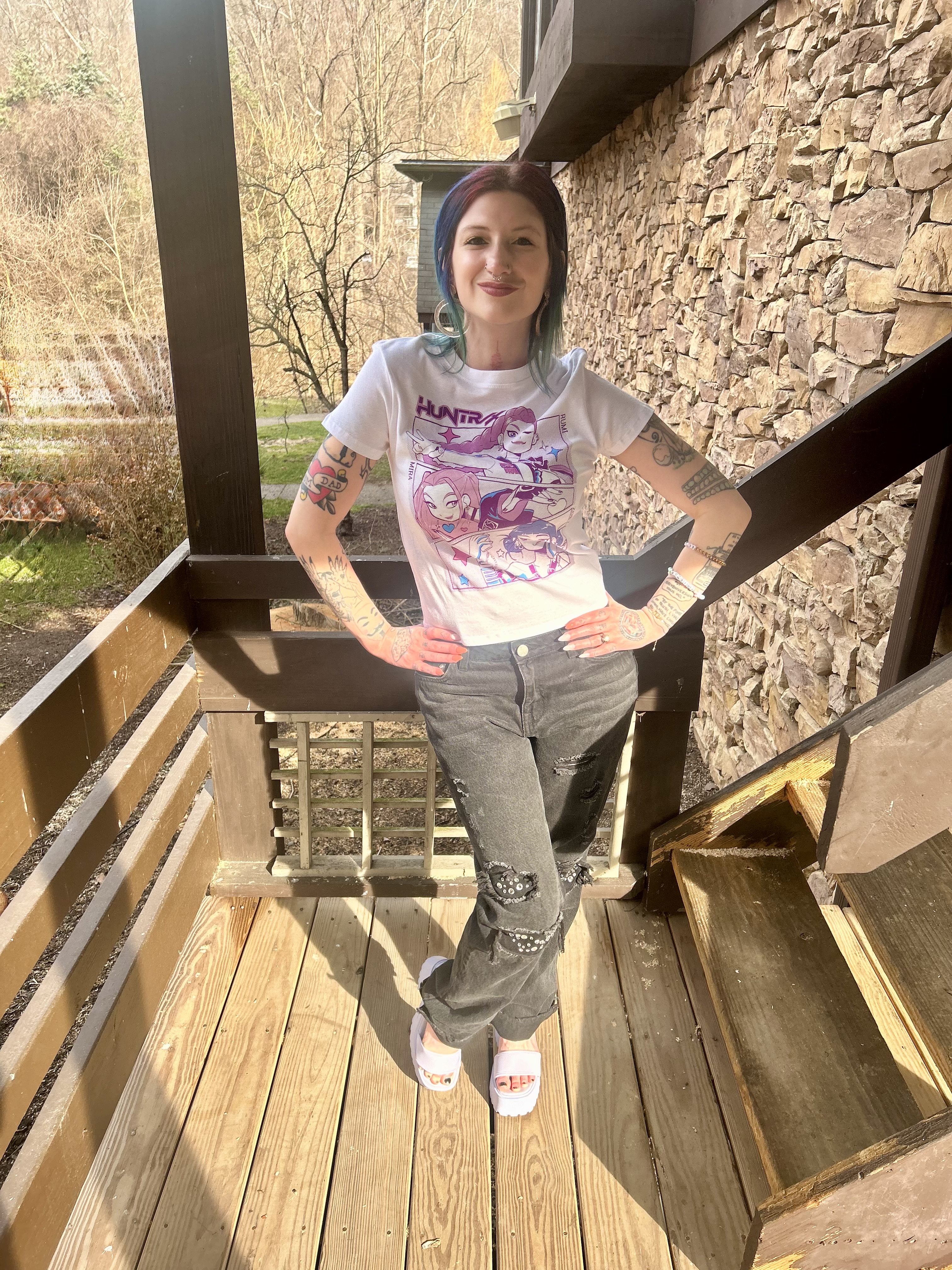 With my K-Pop Demon Hunters cropped tee already in mind, this outfit essentially built itself. And, let me tell you, it was SO nice to simply wear this outfit out sans jacket because we had a glorious sixty plus degree day. Spring, is that you?! Can we talk about how fab this tee is, though? The picture of the Huntrix chicks is just adorable and it fits like a glove. It’s snug without being overly tight which is exactly what I like when it comes to my clothing. The material is soft as can be and I have a feeling I’ll be living in it this spring and summer!