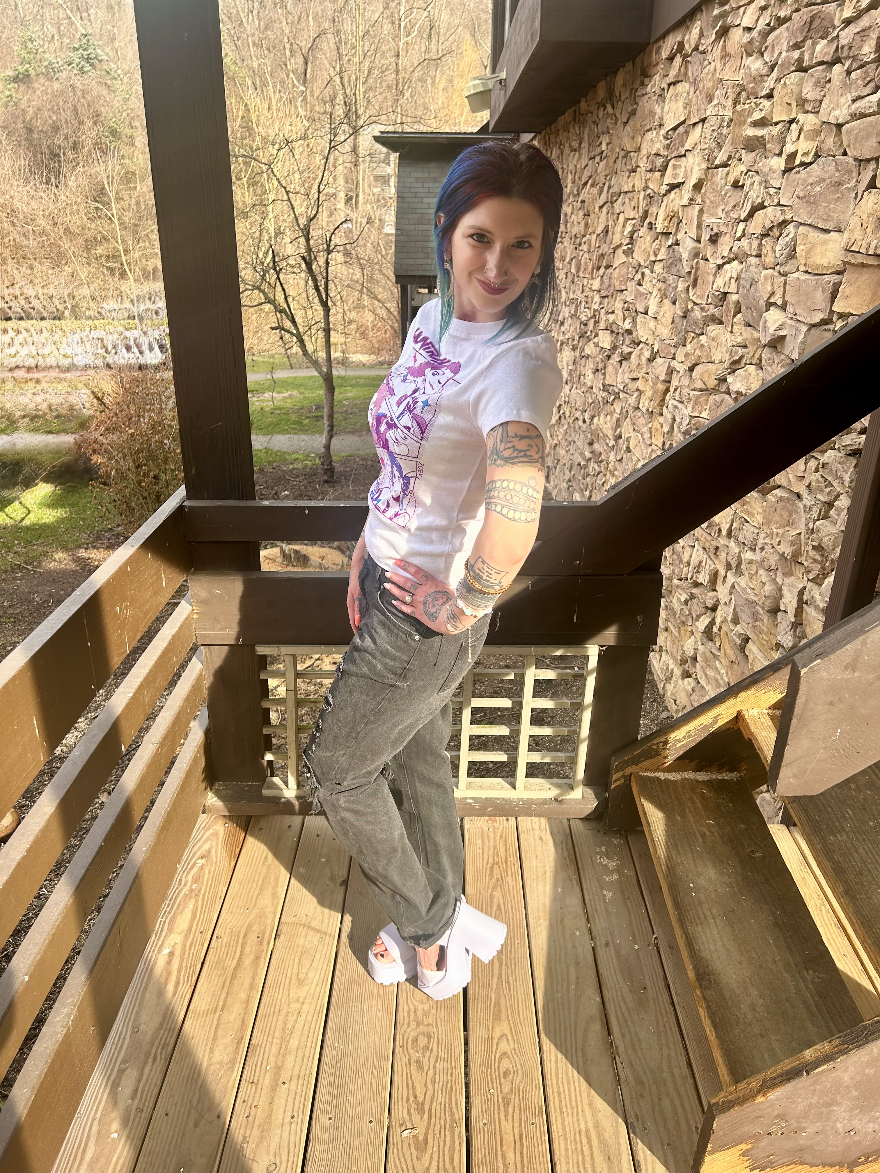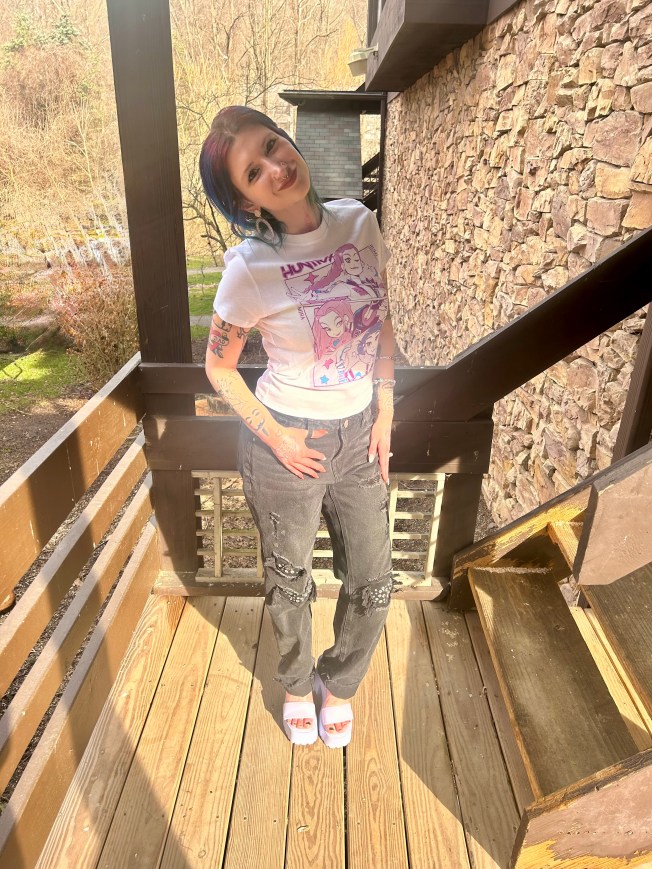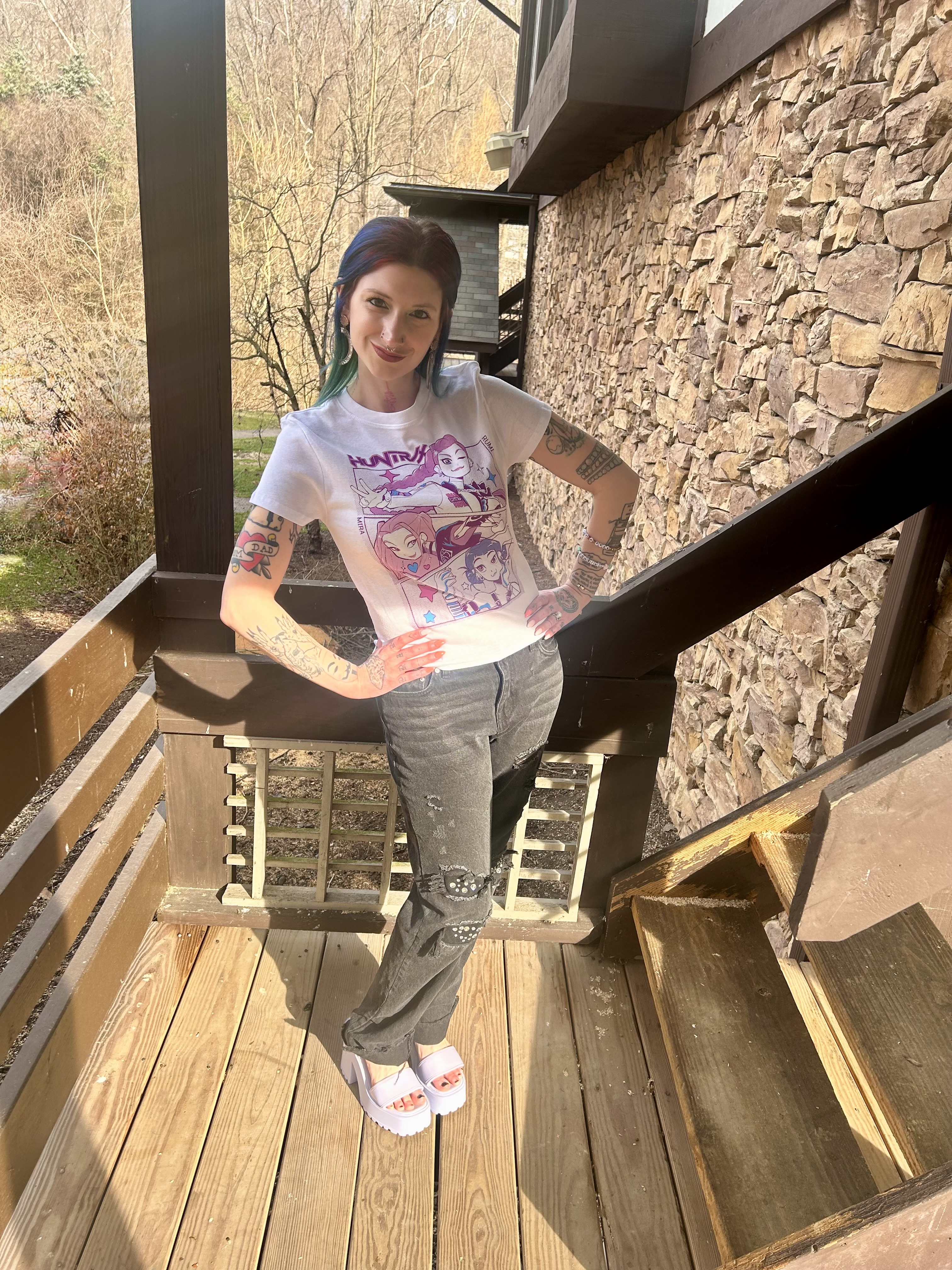 With my K-Pop Demon Hunters cropped tee already in mind, this outfit essentially built itself. And, let me tell you, it was SO nice to simply wear this outfit out sans jacket because we had a glorious sixty plus degree day. Spring, is that you?! Can we talk about how fab this tee is, though? The picture of the Huntrix chicks is just adorable and it fits like a glove. It’s snug without being overly tight which is exactly what I like when it comes to my clothing. The material is soft as can be and I have a feeling I’ll be living in it this spring and summer!