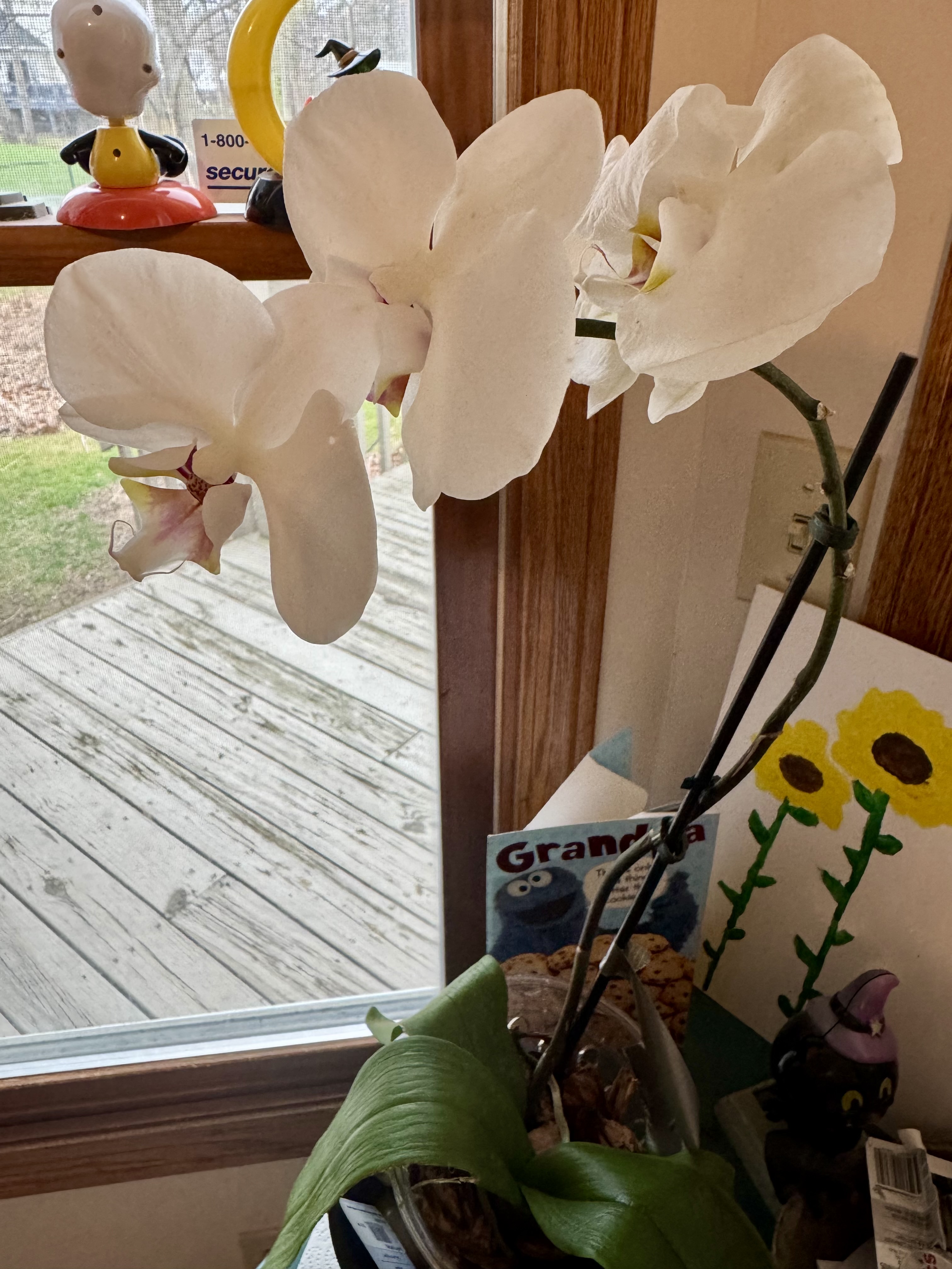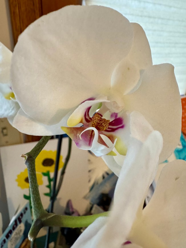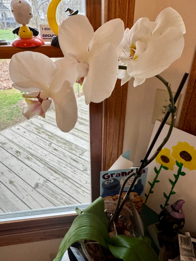 My dad is an excellent gardener and is incredibly knowledgeable on the care of flowers and plants. I called him to tell him about the orchid and requested that he adopt it. He agreed and I was so thankful as I knew my orchid would be in the best, most capable hands. It most certainly was because the day I dropped it off, my mom texted me that he went to the store to get special plant food for it. My dad has been tending to the orchid for the past month and I am so lucky that I get to see it almost every day. It is doing wonderfully: