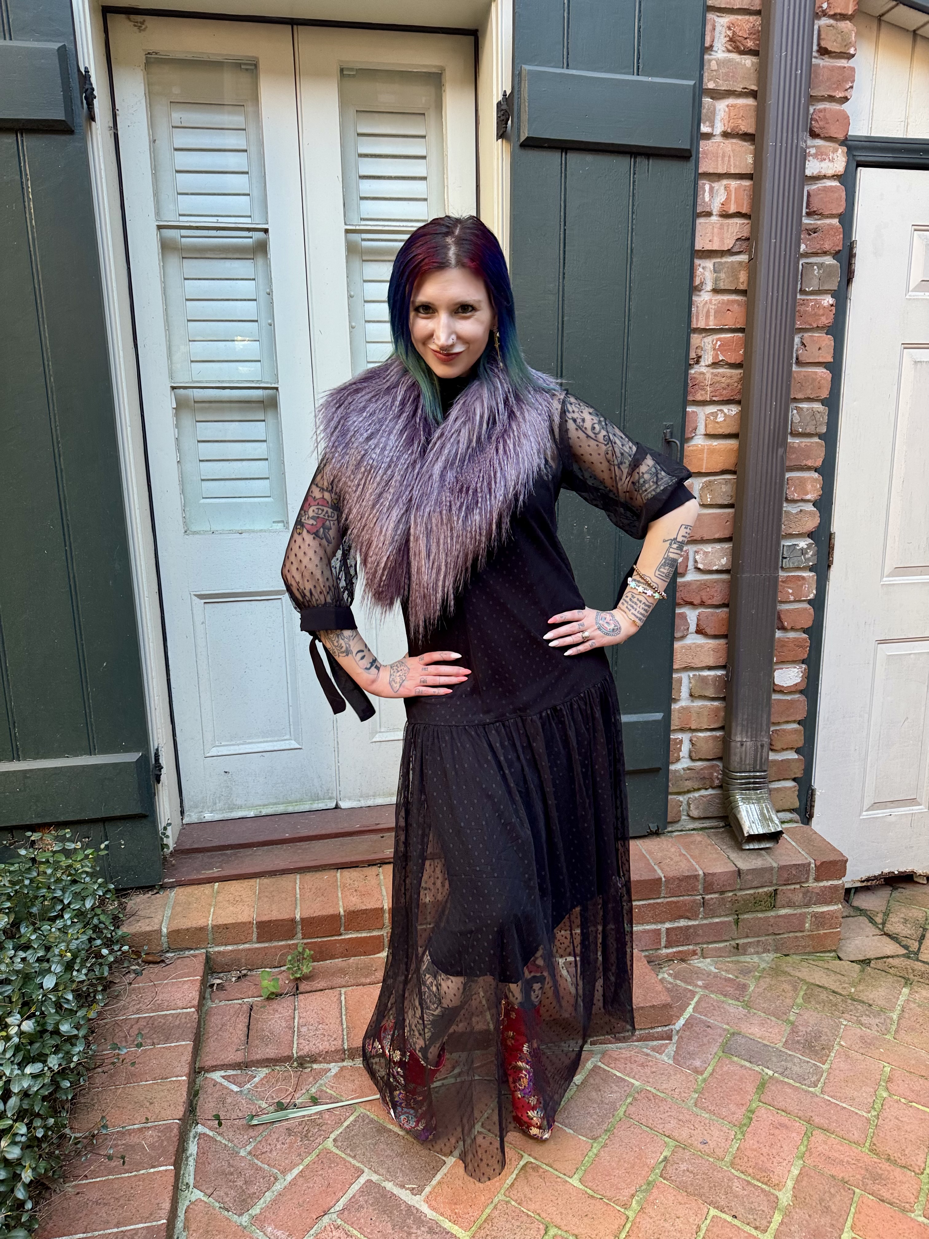 While this dress provided an excellent base, I wasn’t done yet and felt like something was missing. As I racked my brains on what I could add, I landed on faux fur and decided to pair it with an amazing lavender collar by St. Tropez. Regardless of if the dress had a pattern or not, it was still a neutral piece which meant that I could have some fun with accessories and I sure did! The faux fur collar elevated the dress to a whole new level and the silhouette it created was so striking. I have never paired this dress with the collar before and I can’t believe it took me this long to think of it smh.