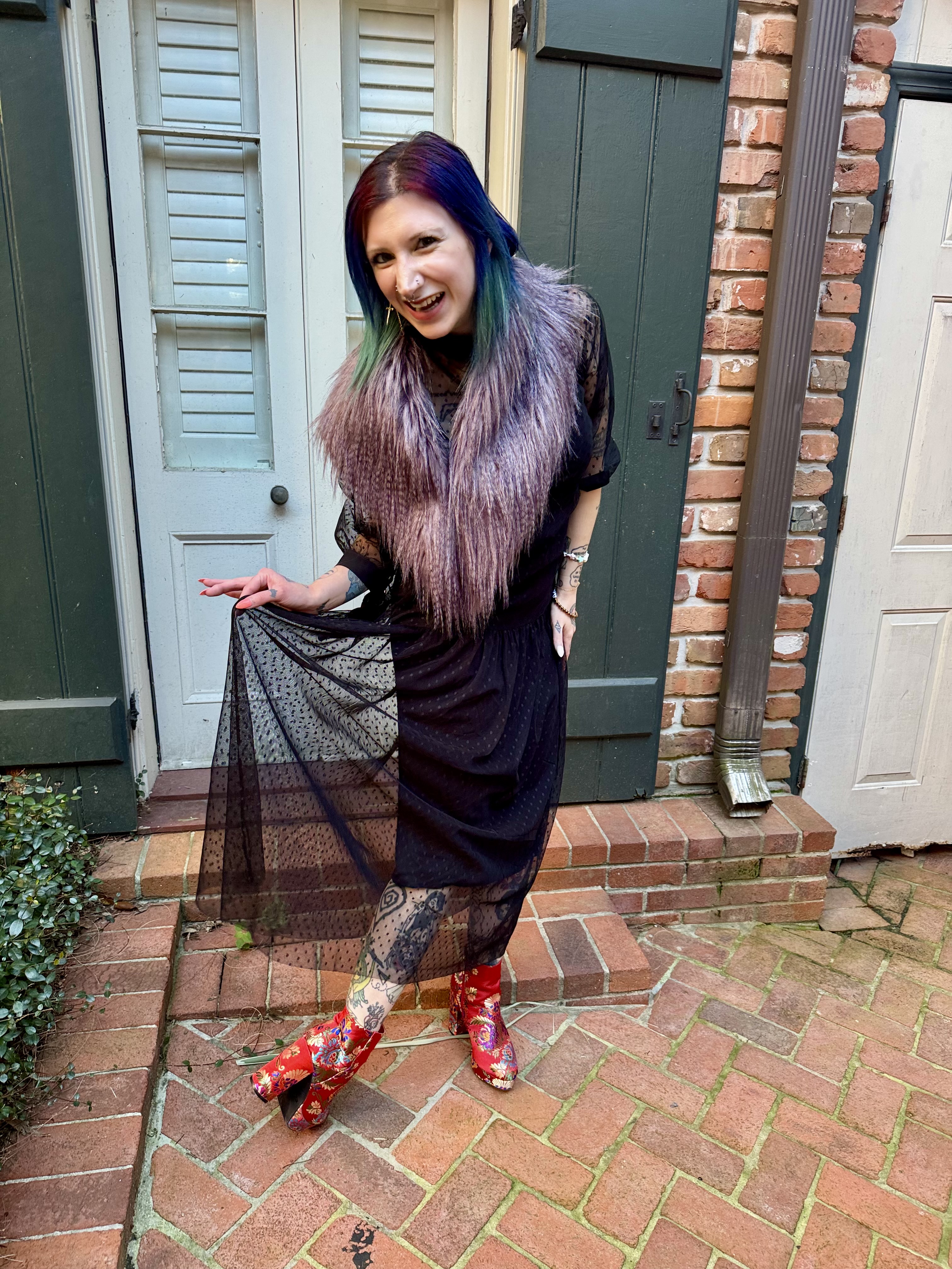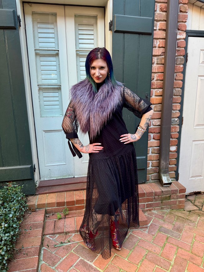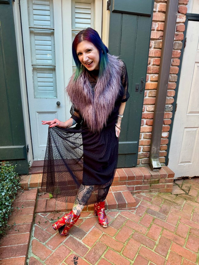 I wanted to bring the drama to the pre-wedding party and I couldn’t imagine a better dress than this fabulous number by Talia Benson. It is one of my favorite dresses I have ever owned and I love it so much that I don’t even care about the slight difficulty getting it on and off. Those connected slip dresses can be tricky! This dress invokes my edgy girly style to the T and I felt like a star in it. That sheer mesh overlay, the dropped waist, and ribbon ties to cap the sleeve truly allow the eyes to dance as there is a lot going on but it still feels so cohesive. It was also the perfect dress to wear in the warm weather of New Orleans as the fabric was so light and breezy!