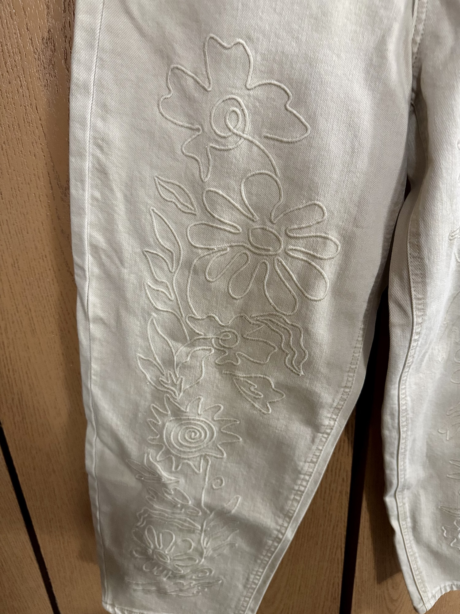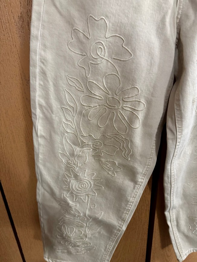 My hopes and dreams were answered when I tried these jeans on because they are everything! The fit is so exciting to me as they clearly balloon down the legs and taper at the ankle. There is nothing skinny about them and, I daresay, it felt good to branch out! And, of course, how cute are those embroidered flowers going down both legs? I am a sucker for anything embroidered and have many a top with my favorite details but no pants! As these jeans are such an exaggerated wide leg fit, my vision is to pair it with an itty bitty tank top to create a silhouette that makes the eyes dance. I can’t wait to rock them so stay tuned for a brand new OOTD coming soon!