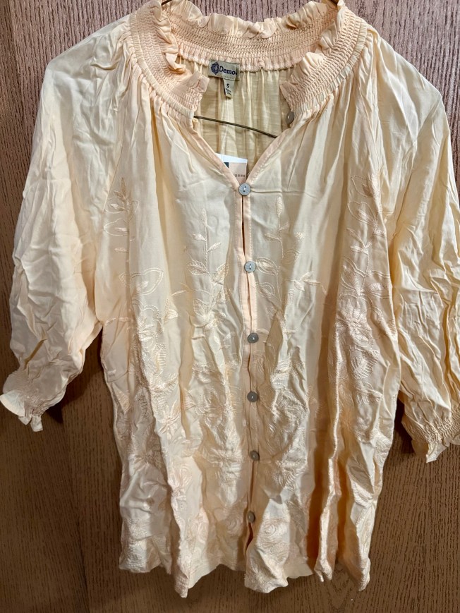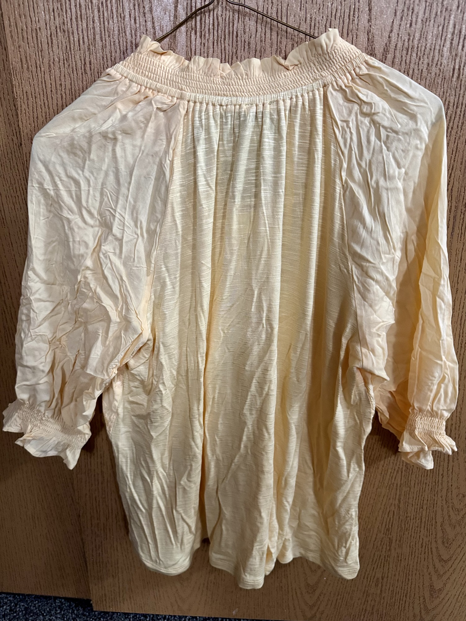 Like the pants you saw yesterday, I wasn’t sure what to think when I saw this top. It didn’t blow me away but I didn’t outright hate it. It was somewhere in between. However, the pale butterscotch color reminded me so much of my grandma. Anything yellow was her favorite! I, too, adore wearing yellow and it’s like a hug from her when I do so. So, into the cart it went! I genuinely wasn’t expecting this blouse to come home with me because I had several other tops to try on. To my surprise, none of them did anything for me while this little Democracy number was doing the most.