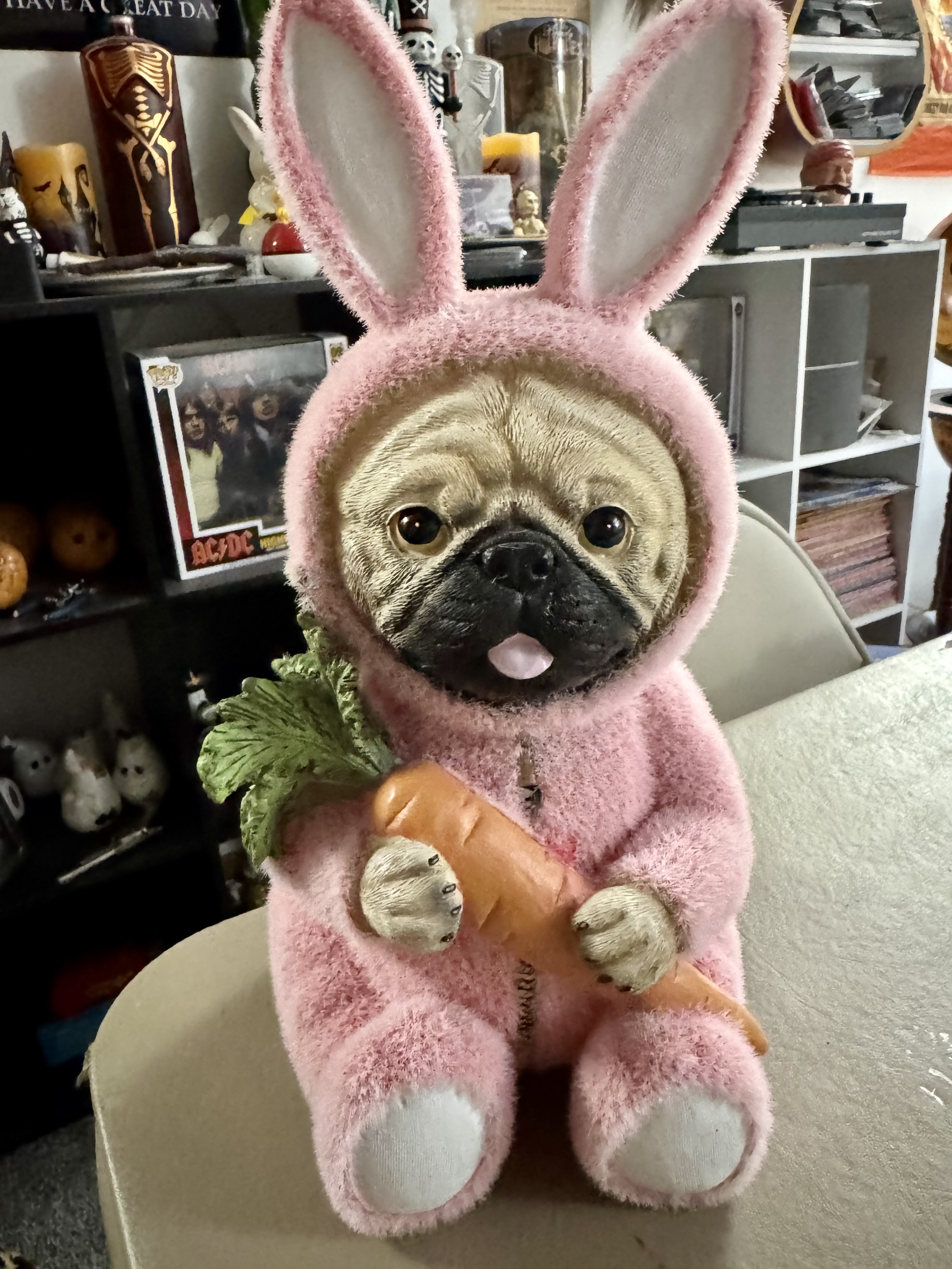 Hello!! While Halloween will always be my favorite home decor season, Easter is a very close second because I love all things BUNNIES!! I am a proud bunny mom to my precious Melvin and Penelope and I always like to get a few pieces of bunny decor per year to honor their existence. A few weeks ago my mom and I went on a shopping trip to TJMaxx and I just might have found my favorite bunny statue to grace our knick knack shelves yet. I present to you the bunny pug: