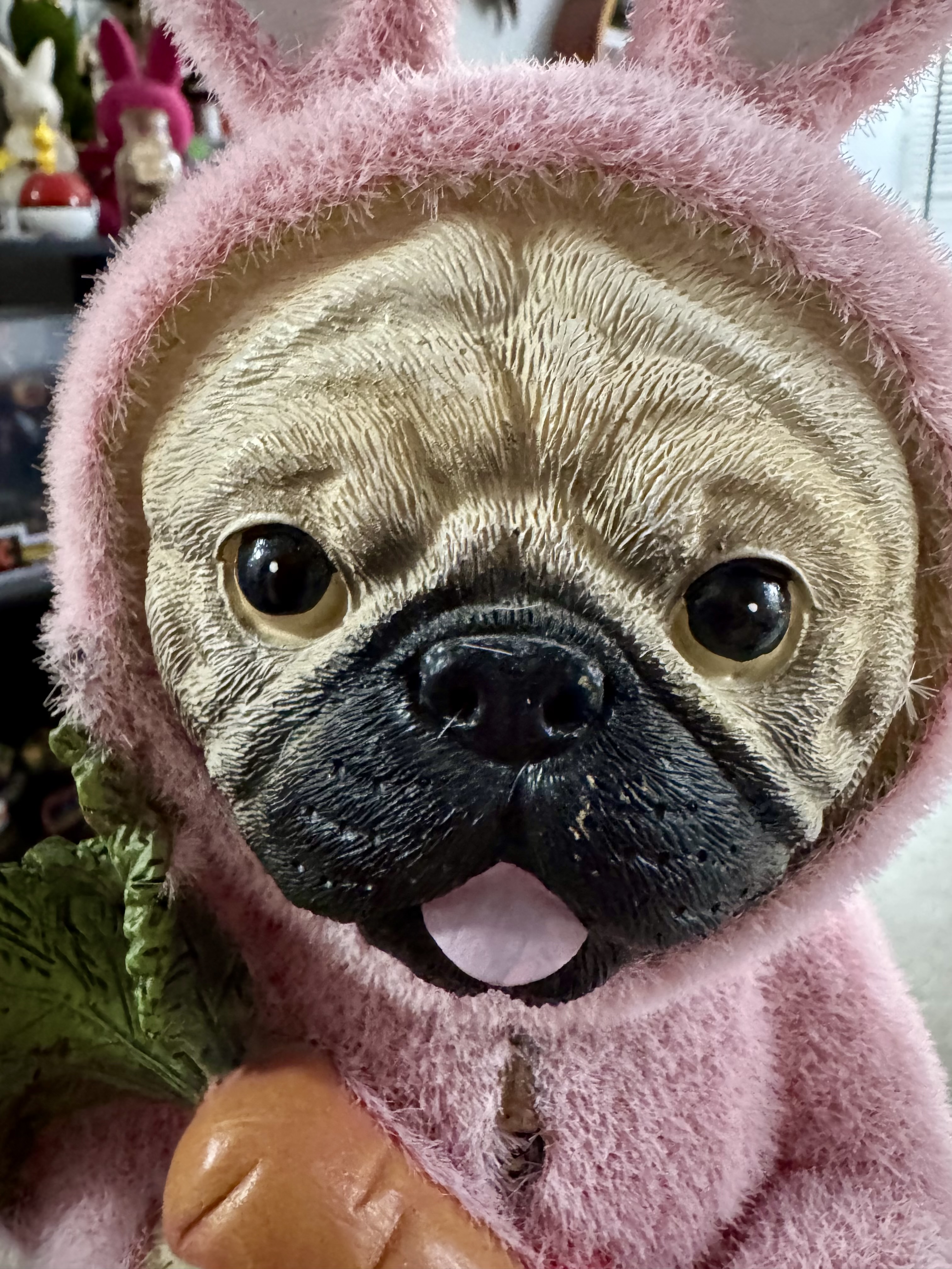 As my mom and I browsed the home decor department, I was so pleased to see that all of the Easter items were marked down significantly. Surprisingly, I didn’t even notice the bunny pug and I’m genuinely not sure how because it’s quite the statement. Thanks to my mom’s eagle eye she pointed it out and it went into the cart immediately. This sweet statue was just six bucks and that is a steal! I thought it was the funniest thing and I knew Johnny would love it too. Especially because it looks like the pug is wearing the pink bunny suit from A Christmas Story – one of our faves!