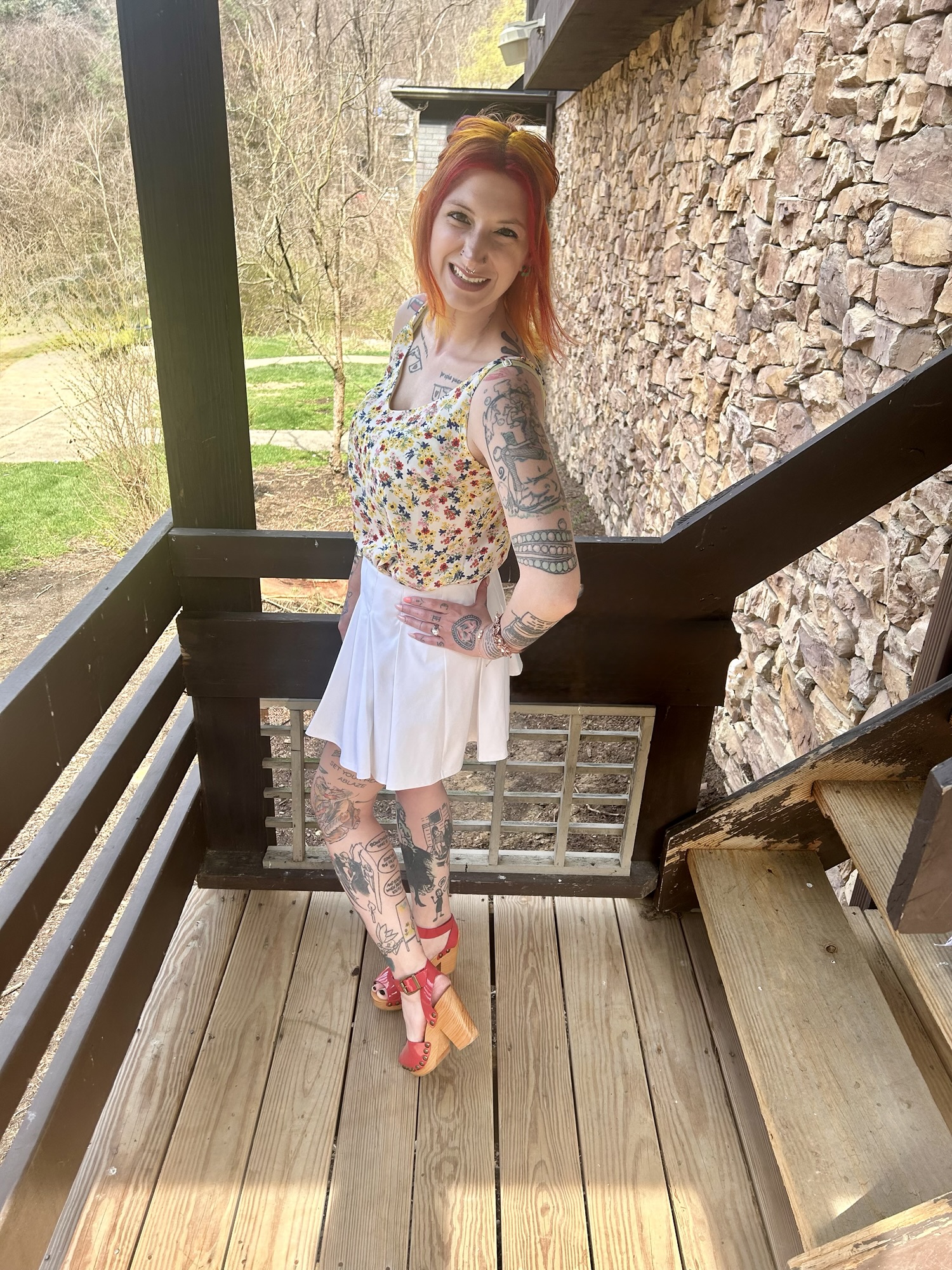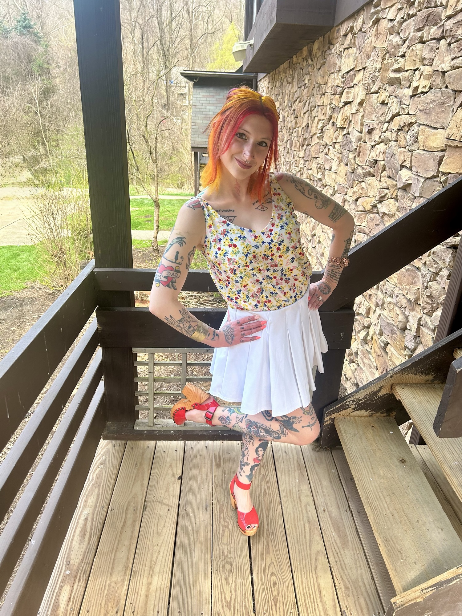 Next on the agenda was a skirt or skort and I picked one of my favorites by Kyodan. The skorts I own from this brand are meant to be worn playing tennis. I don’t play tennis nor do I have the desire to but this skort still serves! See what I did there? I freaking loves me a skort and actually just added a new one into my wardrobe. They are just right for being on the go and not worrying about a sneak peek of my underoos lol. This stark white skort made all of the pretty colors in the cami pop even harder and provides such delightful movement. I loved shimmying and shaking in it when I went to see The Struts last year! 😀