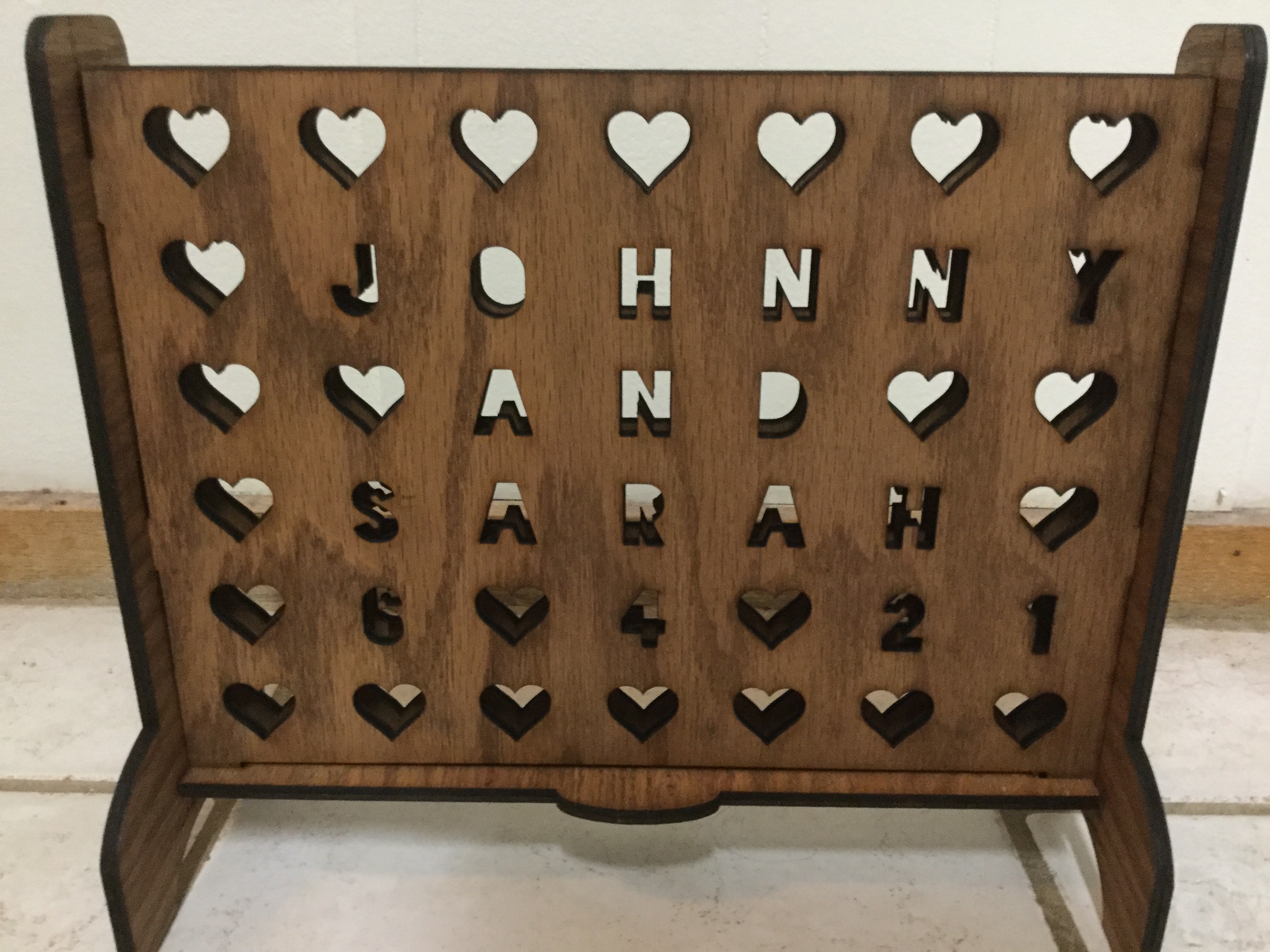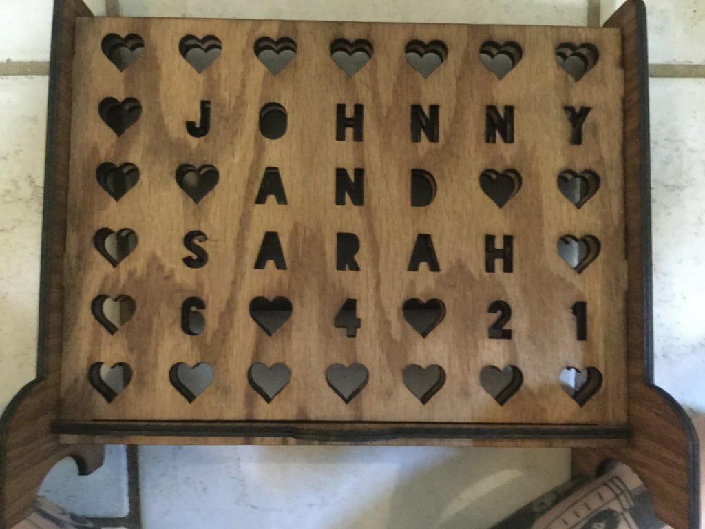 Hello! Johnny and I have been so thankful for the generosity of our friends and loved ones for our recent nuptials. One of the gifts that I am particularly fond of is a customized Connect Four board from my brother and his family. Check it out: