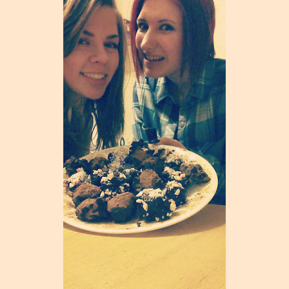 Make Some Candy: I had a glorious best friend afternoon today with my darling Lea, who you guys know all about! It’s very cold in Akron, Ohio (#REPRESENT) right now. Early this afternoon I heard on the news that it felt like -17 degrees outside. Lea and I were supposed to go sledding this afternoon, but when I heard about this drastic cold I thought “oh hell no!” So we opted for a nice, cozy day indoors cooking up some yummy treats. Once we were armed with Dunkin’ Donuts coffee, we began browsing through Pinterest, our activity destination. After ten minutes of scrolling through pages, we decided on making chocolate truffles. We raided the pantry for the we ingredients needed, then ventured back out in the cold to hit up the grocery story for what we didn’t have. The recipe was very easy to make, literally all you had to do was melt your chocolate and other ingredients together, put the chocolate in the freezer to let it stiffen, and then once the mixture is hard enough you roll them into balls and put whatever topping you would like on them. While our chocolate was melting and stiffening, we played Pentatonixs (or however you spell them), looked up the world’s largest body parts on Google Images, and hung out with Lea’s twin brother Bill. When the chocolates were stiff enough to shape them we had a silly time getting our hands dirty, because the chocolate was still gooey! We used peppermint candy that we crushed with a mallet, cocoa powder, and chocolate chips for the toppings on our truffles. They turned out so yummy! You can’t do much to mess up chocolate! 😉 Here’s a picture of us with our finished product! We’re just a bunch of regular ol’ chocolateers!