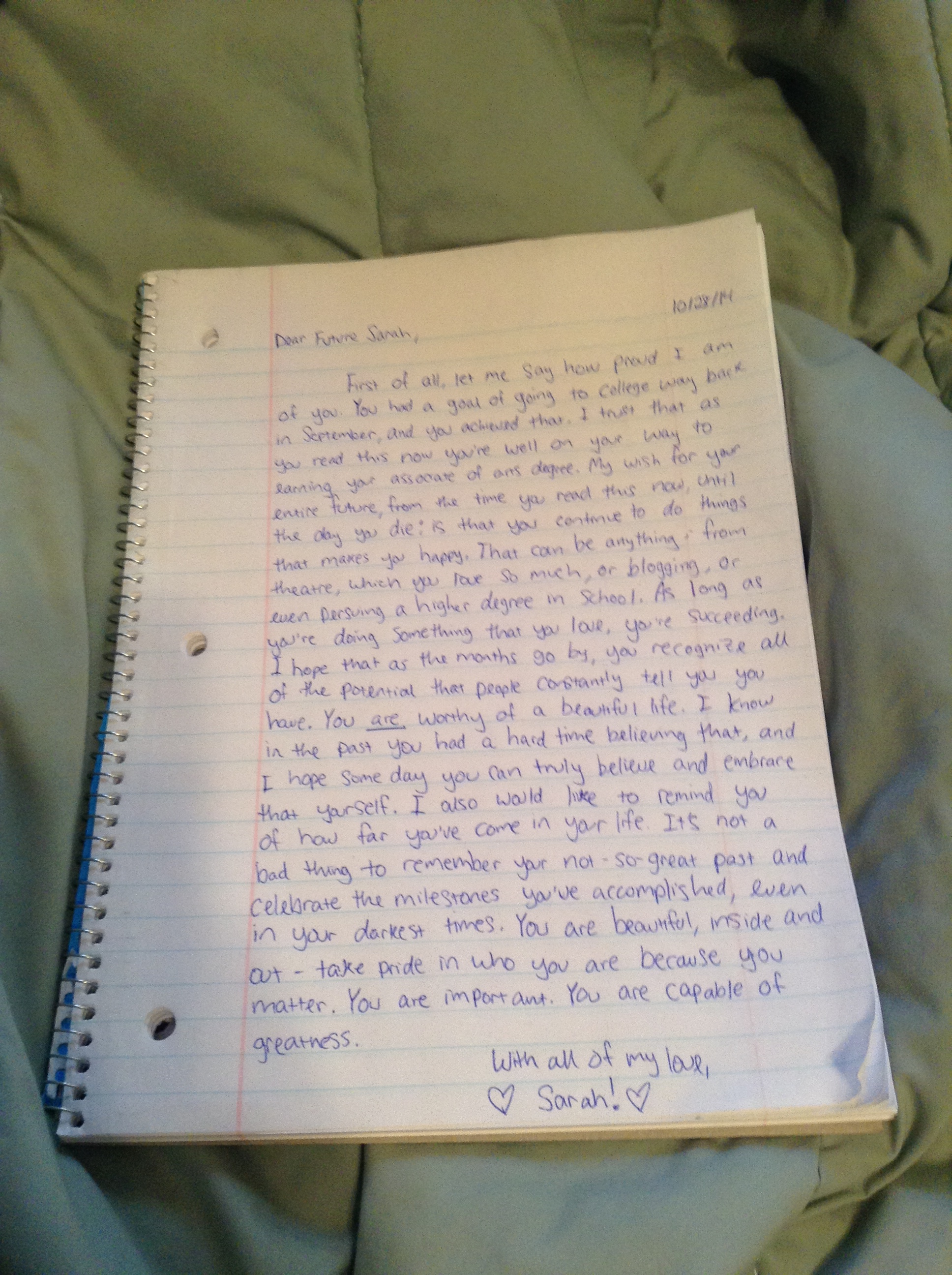 3) Write a letter to yourself. I know, I know, so corny right? Contrary to popular belief – it’s not. One of my first college assignments this past week was to write a letter to my future self. My professor promised all of her students that she wouldn’t be reading our letters, just simply mailing them back to us when she felt the time was right. Our only guideline for the assignment was to be kind to ourselves. With that in mind, I wrote a letter straight from the heart to my future self. I wrote all of the positive affirmations I tell myself and then some and it felt so good. Seeing the words I speak to myself in my head on paper made phrases like “you’re beautiful inside and out” very real to me. If that makes sense? If you’d like to read exactly what I wrote to myself, you can check out my article Letter to Myself. Once you complete your letter, tuck it away somewhere special and whenever you need reassurance or positivity, it will be there for you.