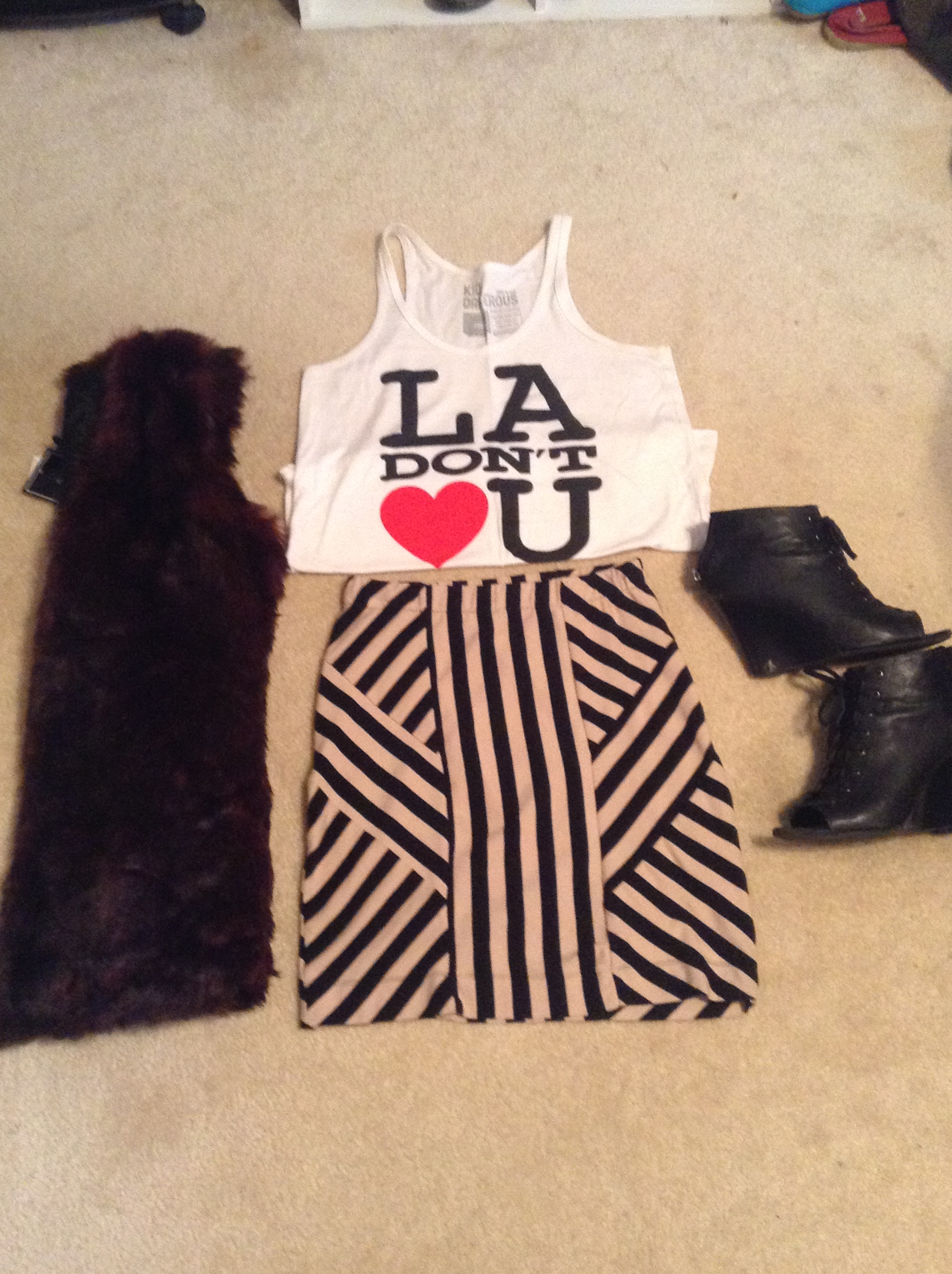 I had no intentions of buttoning the button down on the off chance that I would get too warm at the show. If that were to happen, I could simply slip it off. So, I paired it with a tank top by Kid Dangerous from my old stomping grounds of PacSun. In case you couldn’t tell from that statement alone – this tank is as old as dirt, but it will always remain one of my favorites. The cheeky slogan of “LA Don’t ❤ U” gets me every time and added some humor while adhering to the color palette with the bold red heart. The only thing to do with this top combination was to pull on a pair of black skinnies and it was on to shoes and accessories.