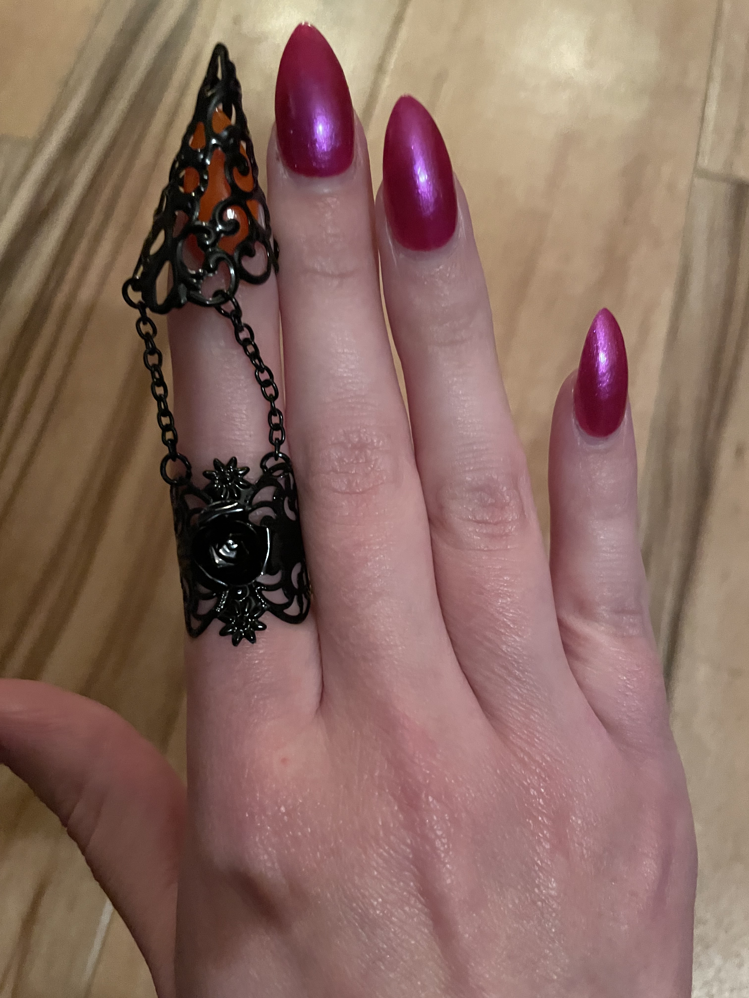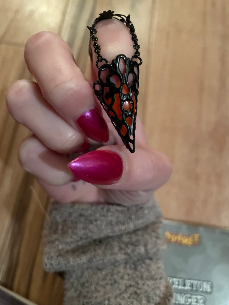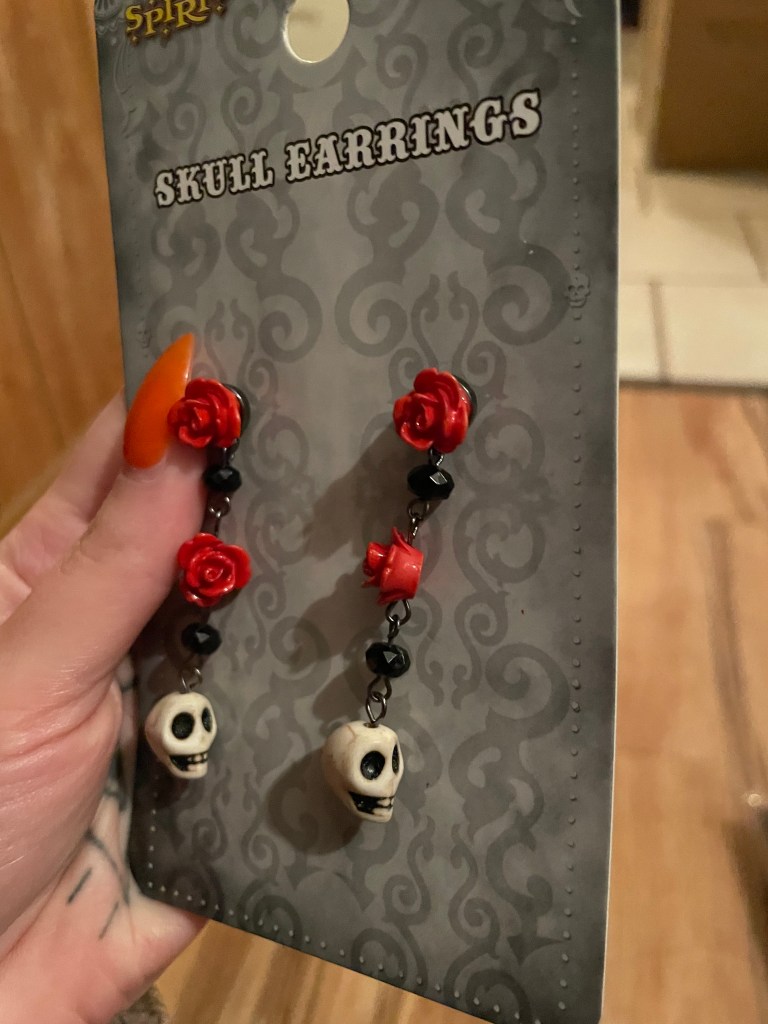 As we made our rounds through spooky decor, everything was pretty picked over. There were a few things that we took note of but nothing worth buying. That is, until the red skull with blinged out devil horns caught my eye. It was the very last one on the shelf and as soon as I saw the ten dollar price tag, it was immediately added to our cart. We are seasoned pros when it comes to Halloween decorations but I had never seen anything quite like this before. This skull is so different from anything we have and its brilliant shade of red speaks sweet nothings to my Lil Red heart. It certainly makes a statement on our many spooky shelves!!