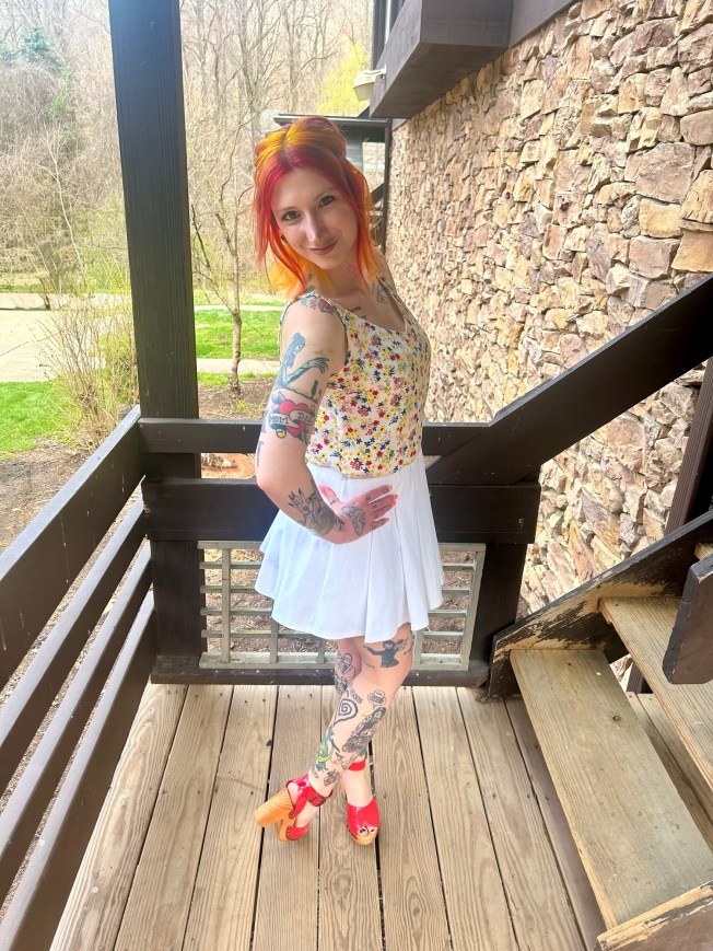 Next on the agenda was a skirt or skort and I picked one of my favorites by Kyodan. The skorts I own from this brand are meant to be worn playing tennis. I don’t play tennis nor do I have the desire to but this skort still serves! See what I did there? I freaking loves me a skort and actually just added a new one into my wardrobe. They are just right for being on the go and not worrying about a sneak peek of my underoos lol. This stark white skort made all of the pretty colors in the cami pop even harder and provides such delightful movement. I loved shimmying and shaking in it when I went to see The Struts last year! 😀